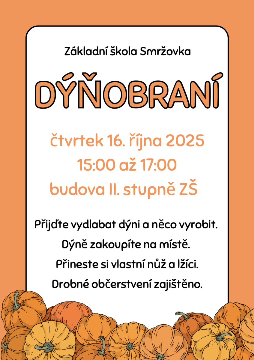 Přijďte na tradiční Dýňobraní ve čtvrtek 16. 10. 2025 od 15.00 do 17:00 v budově II. stupně.